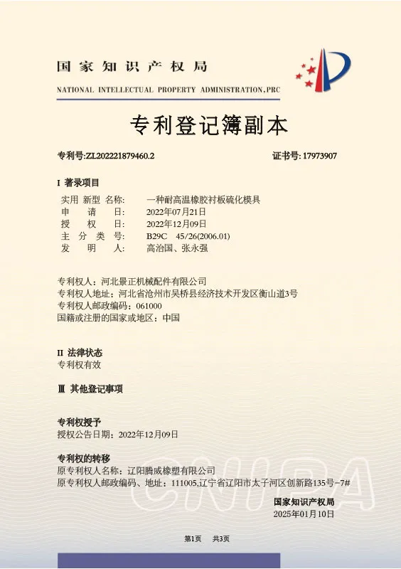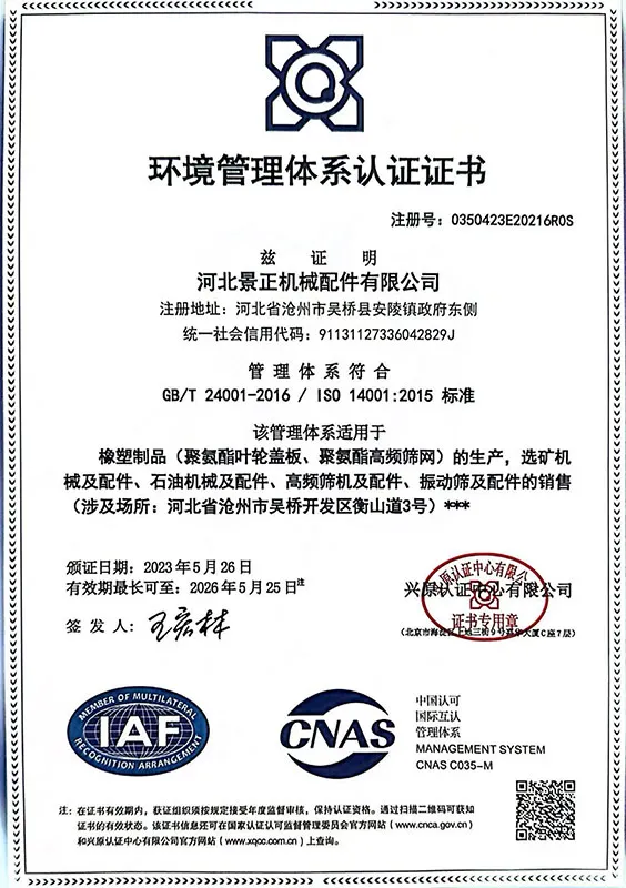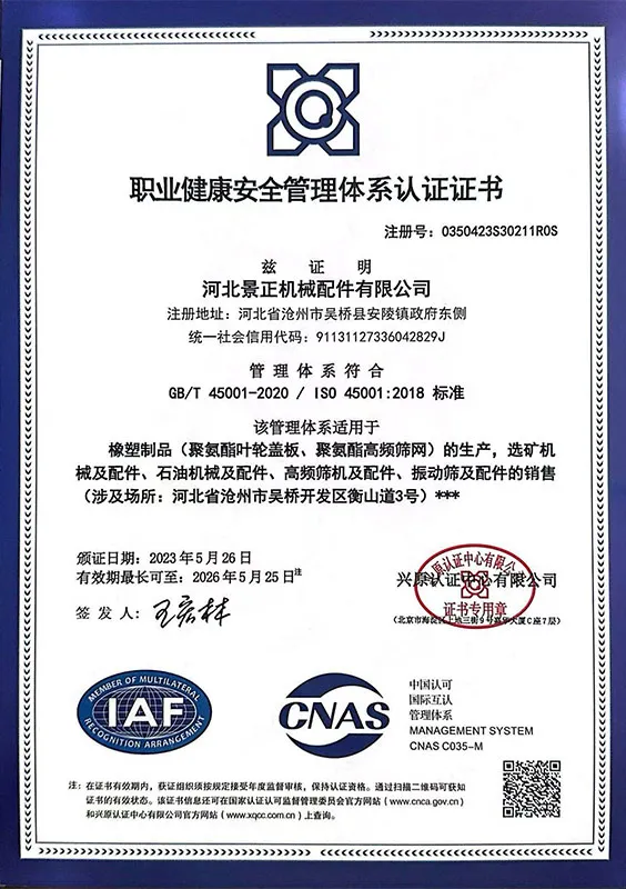 ООО Хэбэй Цзинчжэн Механические Аксессуары, профессиональный производитель изделий из полиуретана и резины, неизменно придерживается принципа «ориентации на качество и расширения своего присутствия в этой области». Компания специализируется на исследованиях, разработках и производстве изделий из резины и пластика, предлагая диверсифицированный ассортимент продукции, включающий полиуретановые высокочастотные сита, полиуретановые крышки рабочих колёс, полиуретановые вибрационные сита, резиновые сита и полиуретановые циклоны. Благодаря превосходным эксплуатационным характеристикам и стабильному качеству эта продукция широко используется в трубопроводных проектах в таких ключевых отраслях, как химическая промышленность, портовое хозяйство, металлургия, энергетика, строительство и добыча природного газа. Компания не только предлагает индивидуальные комплексные решения в области конвейерного оборудования для горнодобывающих предприятий, сталелитейной промышленности и портовых терминалов в более чем 30 провинциях, муниципалитетах и автономных районах страны, но и экспортирует часть своей продукции за рубеж, завоевав широкое признание и популярность на международном рынке. В настоящее время компания располагает 127 единицами современного производственного оборудования, создавая эффективную и интеллектуальную производственную систему, способную быстро реагировать на разнообразные требования рынка. Благодаря комплексному контрольно-испытательному оборудованию и комплексным методам испытаний, каждый этап процесса, от поступления сырья до готовой продукции, тщательно проверяется, чтобы гарантировать соответствие каждого продукта высоким стандартам качества и предоставление клиентам надежных гарантий качества.
